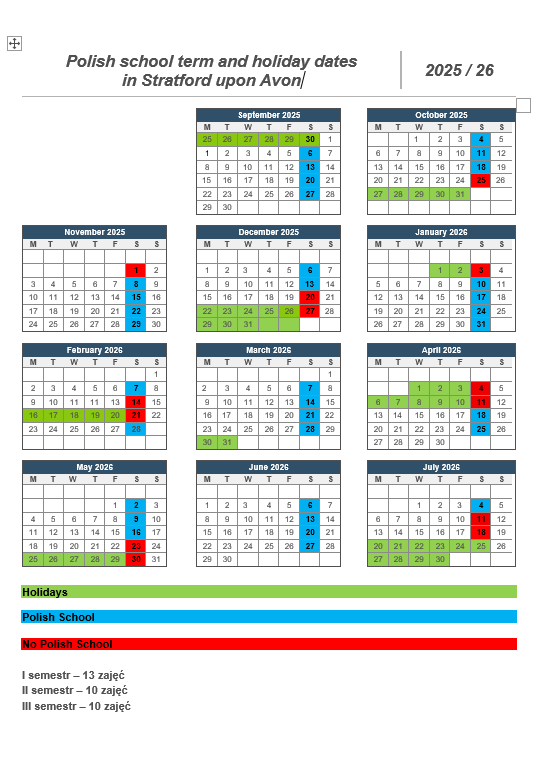 UWAGA!!! Ruszamy już 9 września o godzinie 9. Przed nami 32 spotkania. Oprócz zajęć z języka polskiego, geografii i historii Polski oferujemy Państwu spotkania z kulturą Polski poprzez uczestniczenie dzieci ( a czasem także i Rodziców) w rozmaitych imprezach towarzyszących szkole. W planach dni tematyczne, spektakl teatralny dla dzieci, obchody Dnia Niepodległości, spotkanie wigilijne, Bal…
